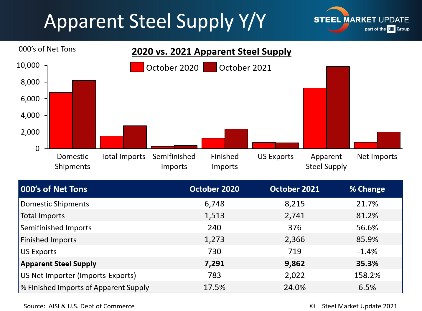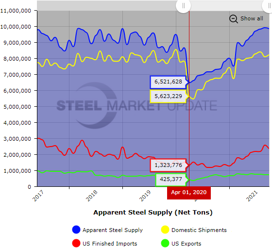 Apparent steel supply, a proxy for demand, is determined by combining domestic steel mill shipments and finished U.S. steel imports, then deducting total U.S. steel exports.