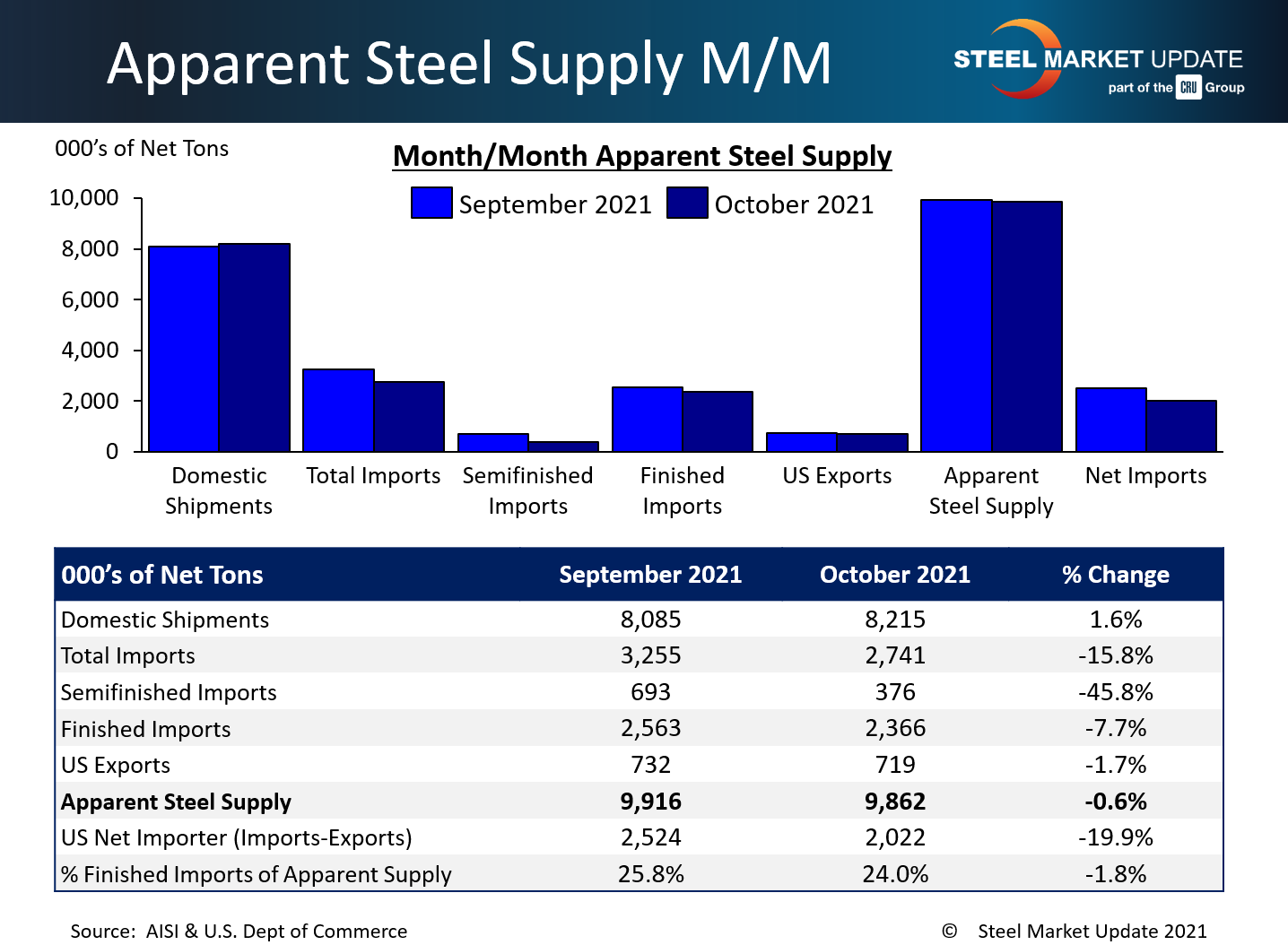 Compared to the month prior when apparent supply was 9.92 million tons, October supply declined by 55,000 tons. This decrease was due to a 197,000-ton decline in finished imports, partially negated by a 130,000-ton increase in domestic shipments and a 12,000-ton decrease in exports. The net trade balance between imports and exports in October fell 19.9% compared to September, while the percentage of apparent steel supply composed of finished steel imports decreased 1.8%.
