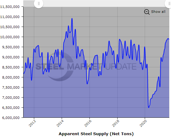 To see an interactive graphic of our Apparent Steel Supply history (example shown below), visit the Apparent Steel Supply page in the Analysis section of the SMU website. If you need any assistance logging into or navigating the website, contact us at info@SteelMarketUpdate.com.