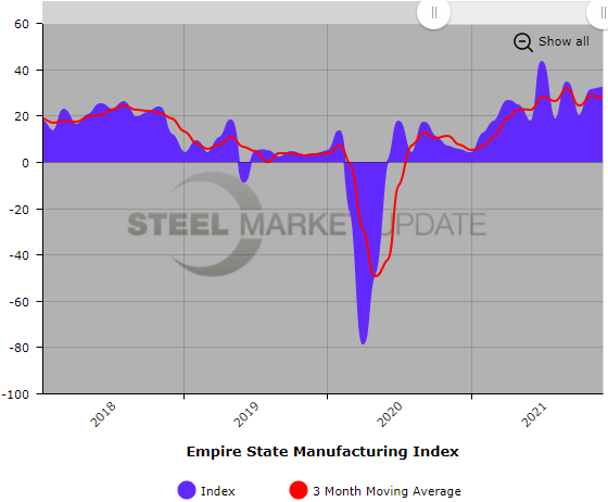 Below is a graph showing the history of the Empire State Manufacturing Index. You will need to view the graph on our website to use its interactive features. You can do so by clicking here. If you need assistance logging into or navigating the website, please contact us at info@SteelMarketUpdate.com.