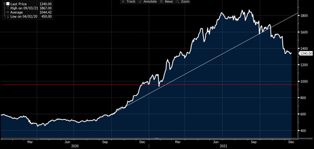 Does it make sense to say – “If you can make it through this year, then you can make it through anything”? It depends on your positioning. If you were a steel buyer this year, you’ve had to deal with unprecedented challenges – unless you had hedged yourself in late 2020 for the year or had a fixed price supplier deal that covered you. In addition, you probably had to worry about delivery issues and the myriad of supply-chain problems that the economy experienced over the past 12 months. Even if you had hedged yourself in late 2020, you are now faced with hedging your steel buy at much higher levels this year. The chart below shows the three-month forward HRC contract over the past two years.