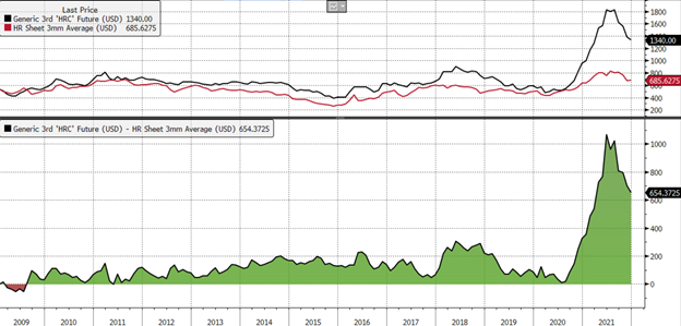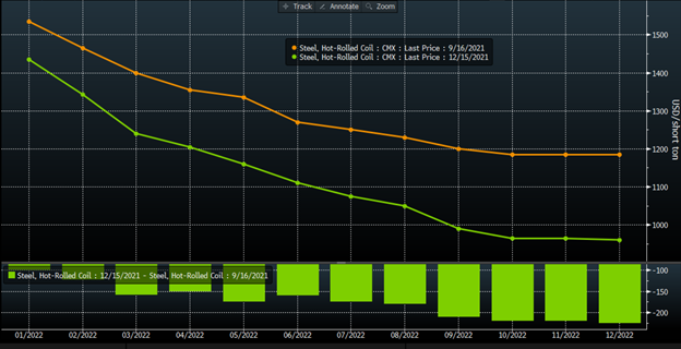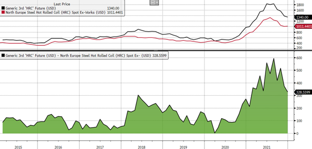 You can see that the curve has come under some significant pressure, falling anywhere from $100 to $200. So hedging your inventory is more challenging in 2022, but locking in lower prices on a steel buy is getting more attractive.