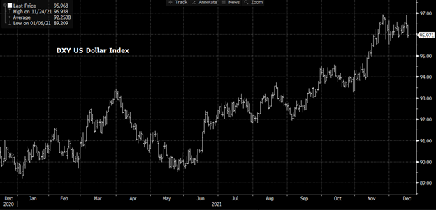 The Fed changing policy here in the U.S. is also worth considering, as they start to “taper” asset purchases and begin raising rates next year. Normally this would lead to a stronger U.S. dollar and lower commodity prices, all else equal. Indeed, the dollar has already been strengthening this year to some degree: