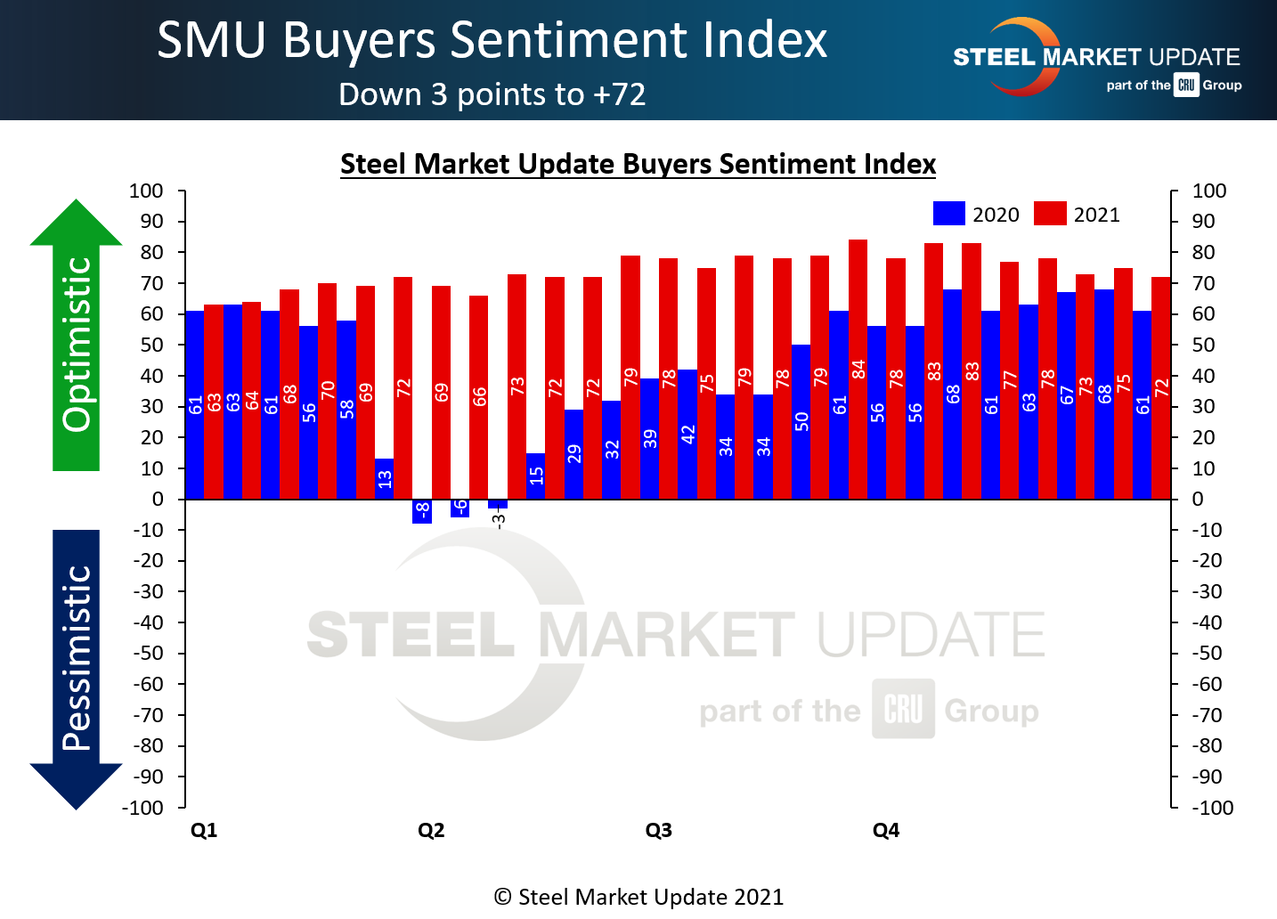 SMU Steel Buyers Sentiment Index is a measurement of the current attitude of buyers and sellers of flat-rolled steel products in North America regarding how they feel about their company’s opportunity for success in today’s market. It is a proprietary product developed by Steel Market Update for the North American steel industry.