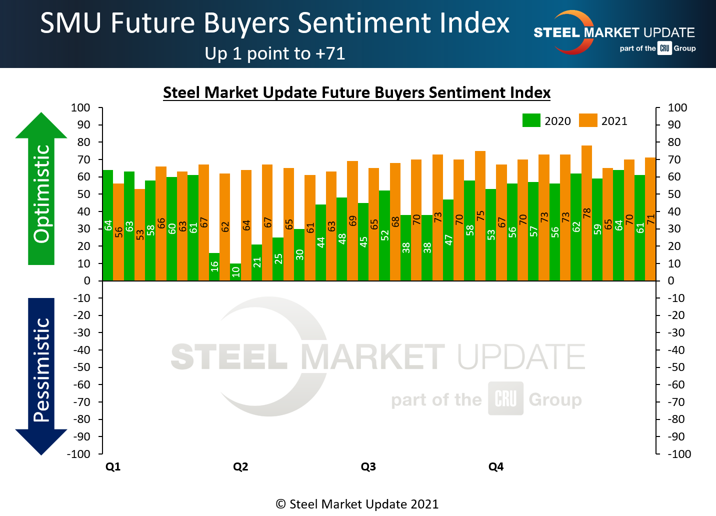 Future Sentiment – which measures steel buyers’ feelings about their prospects three to six months in the future – increased by one point to +71, just seven points below the record reading of +78 seen last month.
