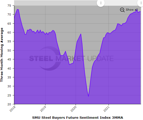 Steel Buyers Sentiment, as measured by Steel Market Update, has not reacted much to declining steel prices. Perhaps because prices remain well above historical averages even after big declines – more than 18% when it comes to hot-rolled coil – over the past three months. Indeed, 2021 was a record year for many companies, leaving most buyers with a bullish outlook on the year ahead.