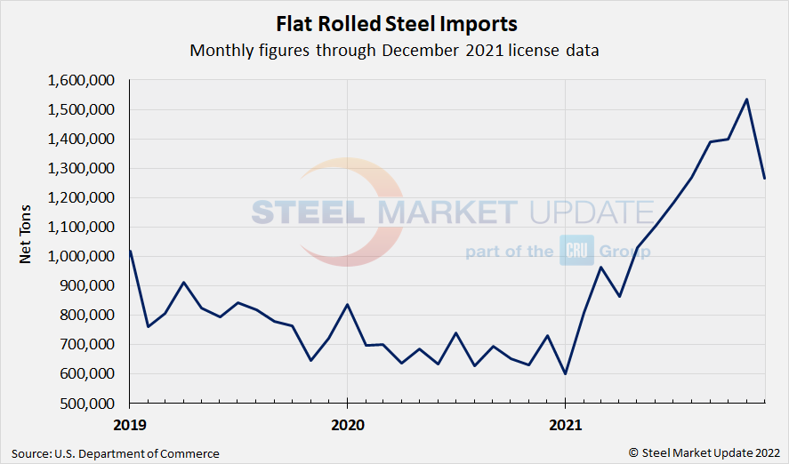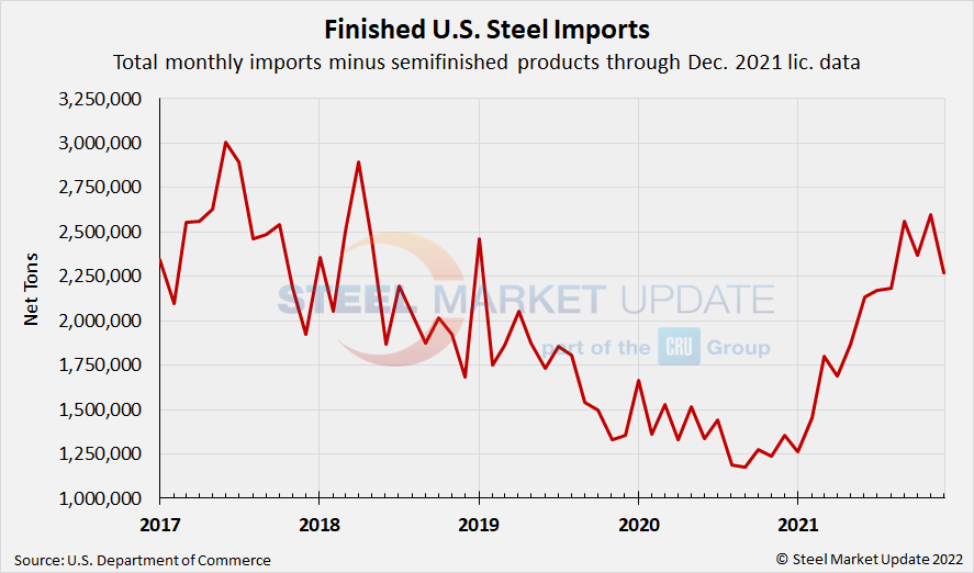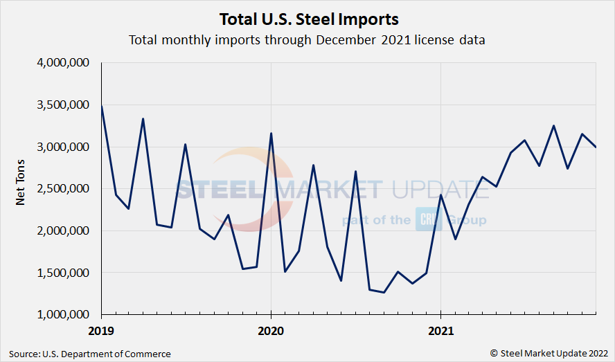 Due to large month-to-month swings in semifinished imports, the chart below shows total monthly imports on a three-month moving average (3MMA) basis in an attempt to more accurately display U.S. steel import trends. The 3MMA through final November data reached 3.05 million tons, the highest level seen in over three years. Recall that the lowest 3MMA level in SMU’s recent history was November 2020 at 1.36 million tons. Looking at the latest December license data, that 3MMA is currently at 2.96 million tons.