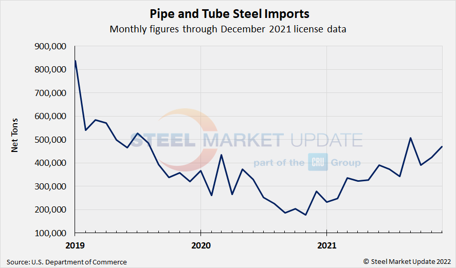 The two charts below show monthly imports grouped by product category: flat rolled imports and pipe and tube imports. Flat rolled imports continued to climb through November, reaching a new multi-year high of 1.54 million tons. December license data currently shows 1.27 million tons coming into the country. Pipe and tube imports were finalized at 424,000 tons in November, and December licenses are currently up 11% to 470,000 tons.