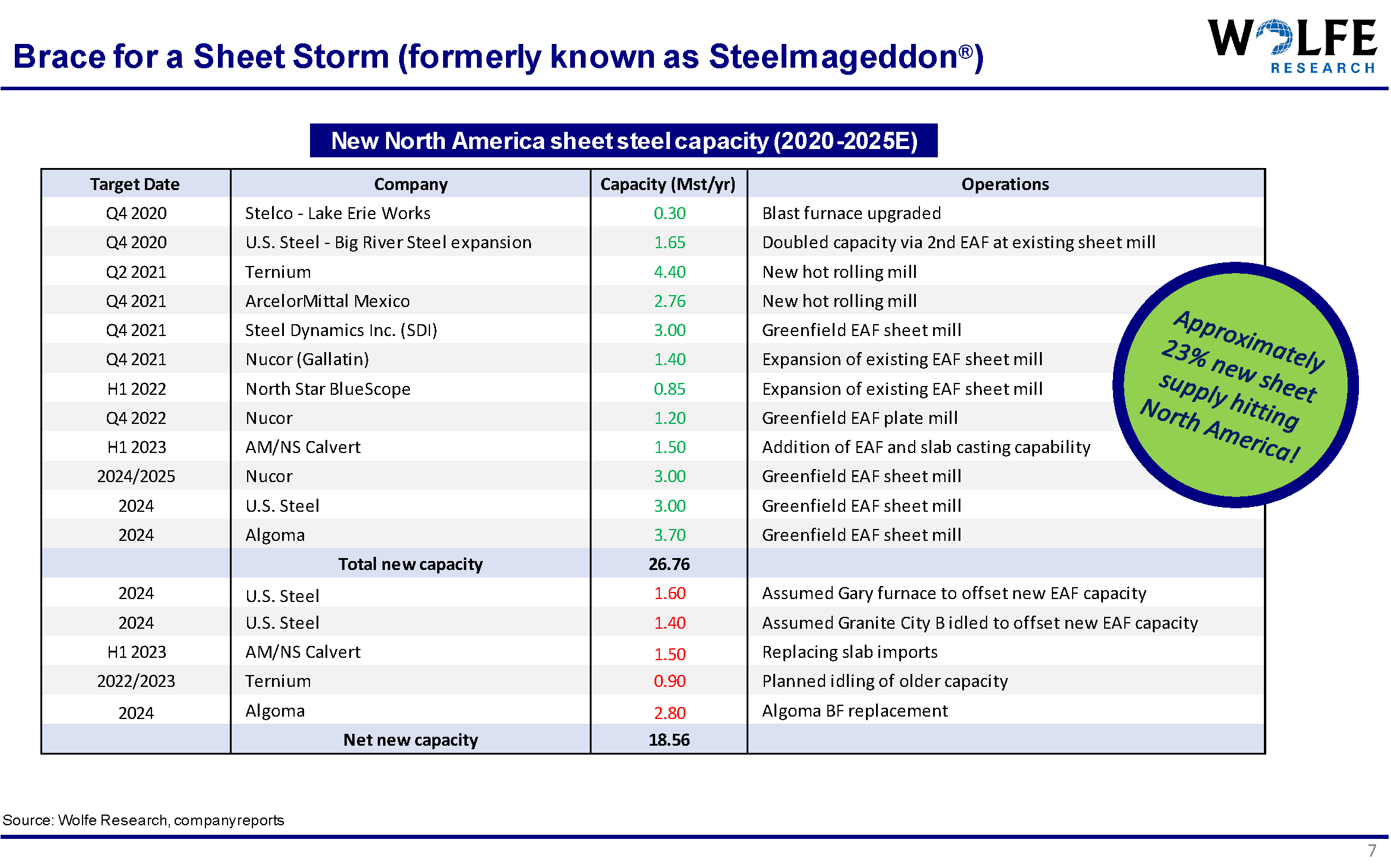 And the downtrend in steel pricing is likely to continue for years to come as steelmaking capacity outpaces demand. Wolfe Research is tracking a dozen capacity expansions at mills across North America that could add a net 18.5 million tons of steel sheet capacity by 2025 (see chart below, click to enlarge). “That adds up to about 23% more sheet supply hitting North America,” she noted.