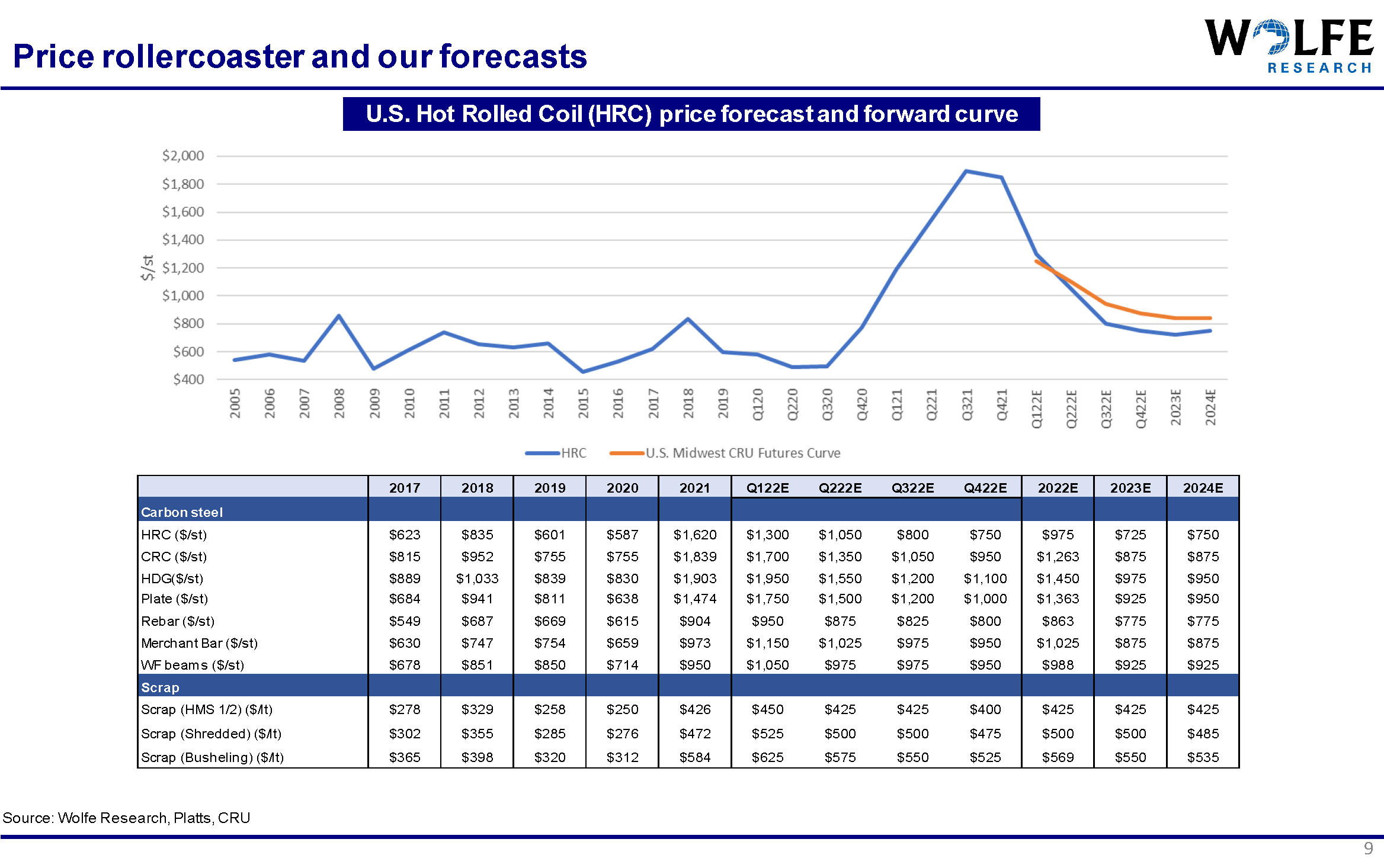 Looking more short-term, Tanners and Wolfe are forecasting an average price of $1,300 per ton for hot rolled in the first quarter this year. That compares to the current HR price published by Steel Market Update this week at $1,535 per ton. And HR prices have already dropped by more than $400 per ton since peaking in early September. Wolfe’s forecast calls for HR prices to end the year at around $750 per ton for an average in 2022 of $975 per ton (see chart below, click to enlarge). “Everyone is looking for some stability in the steel price. I don’t think they are going to get it in the next couple months,” Tanners said.