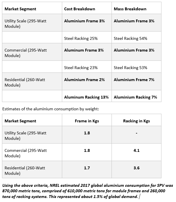 The U.S. National Renewable Energy Laboratory (NREL) provided some excellent foundational “rules of thumb” for estimating aluminum demand in SPV in a July 2019 analysis.