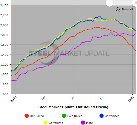 SMU Note: Below is a graphic showing our hot rolled, cold rolled, galvanized, Galvalume, and plate price history. This data is available here on our website with our interactive pricing tool. If you need help navigating the website or need to know your login information, contact us at info@SteelMarketUpdate.com.