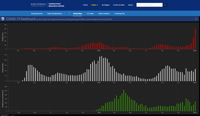 Despite the dramatic rise in COVID cases as evidenced below, it seems the term “flattening the curve” has fallen out of favor. Early in the pandemic it became a consistent mantra as we attempted to avoid overwhelming the health care system and buy time until vaccines could be developed and deployed. Fortunately, the chart below shows that the recent spike in cases (red bars) has not resulted in a similar rise in deaths (white bars) as was seen in the Dec20-Jan21 growth in cases or in the Delta variant wave rise of Sept-Oct 2021. Much has been written about the lesser severity of the Omicron strain, and I hope that as more people are exposed and we increase immunity (naturally or through vaccines), that future strains will be less fatal regardless of how contagious they may be. On a side note, thanks to all the tireless efforts of healthcare professionals helping to fight this pandemic!