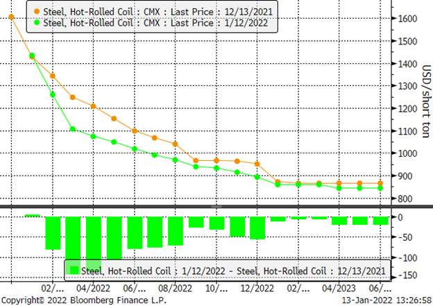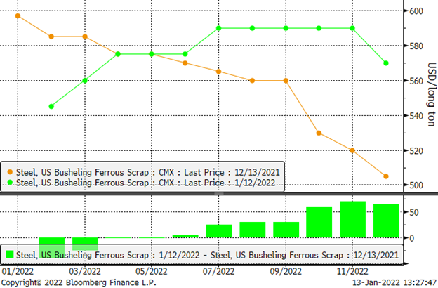 Scrap futures on the other hand are pointing to a much different view of 2022 as the curve has shifted from backwardation to contango over the course of the month, with Q4 2022 prices up near 10% from last month.
