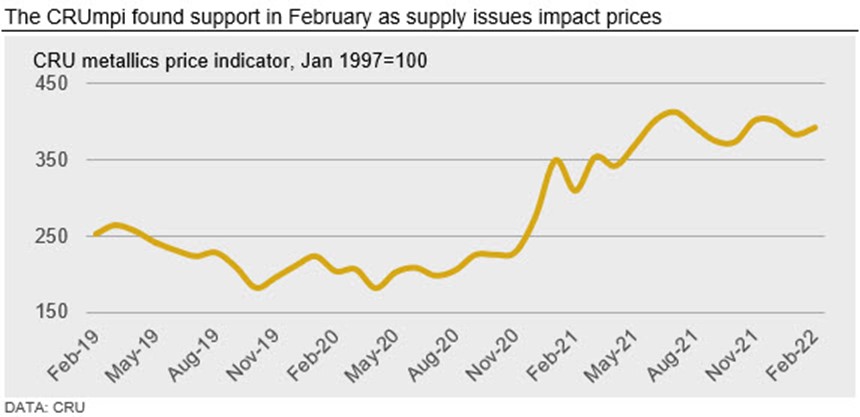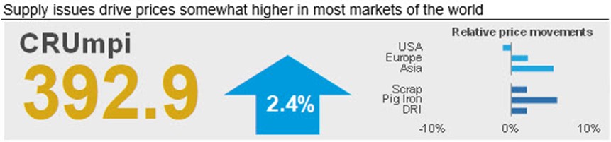 The CRU metallics price indicator (CRUmpi) rose in February m/m by 2.4% to 392.9, gaining back some of the ground lost during January’s unusually bearish market. This slight upward trend was driven primarily by supply scarcity for obsolete grade scrap and pig iron, although plentiful prime scrap and falling finished steel prices dragged some prices lower in North America. We expect supply issues to persist into March, creating yet more upside price pressure for metallics.
