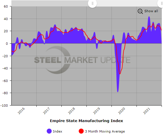 Below is a graph showing the history of the Empire State Manufacturing Index. You will need to view the graph on our website to use its interactive features. You can do so by clicking here. If you need assistance logging into or navigating the website, please contact us at info@SteelMarketUpdate.com.