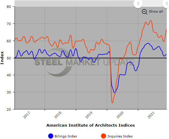 Below is a graph showing the history of the AIA Architecture Billings Index. You will need to view the graph on our website to use its interactive features; you can do so by clicking here. If you need assistance logging into or navigating the website, please contact us at info@SteelMarketUpdate.com.