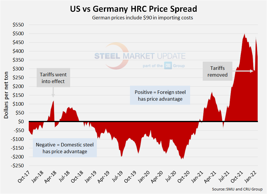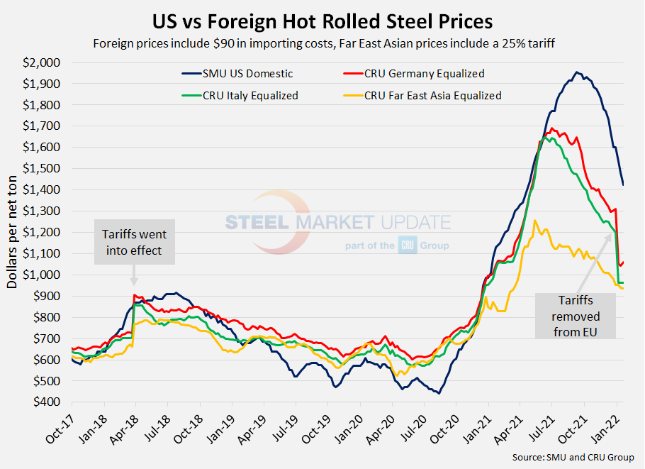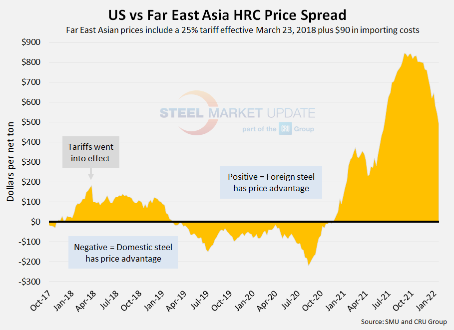 The following calculation is used by Steel Market Update to identify the theoretical spread between foreign hot rolled steel prices (delivered to U.S. ports) and domestic hot rolled coil prices (FOB domestic mills). This is only a “theoretical” calculation as freight costs, trader margins, and other costs can fluctuate, ultimately influencing the true market spread. This compares the SMU U.S. hot rolled weekly index to CRU hot rolled weekly indices for Germany, Italy, and Far East Asian ports.