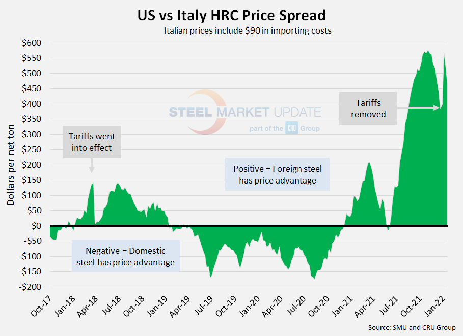 CRU published Italian HRC prices at $874 per net ton ($963 per metric ton), up $2 from last week, and down $25 from one month ago. After adding import costs, the delivered price of Italian HRC is approximately $964 per ton. Accordingly, domestic HRC is theoretically $461 per ton more expensive than imported Italian HRC, down from $518 last week. Prior to removal of the 25% tariff, the early-November spread of $577 per ton was the largest seen in SMU’s limited data history. Prior to 2021, the previous record high was $143 per ton in July 2016.