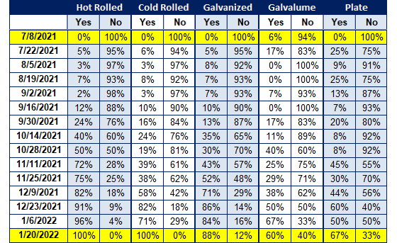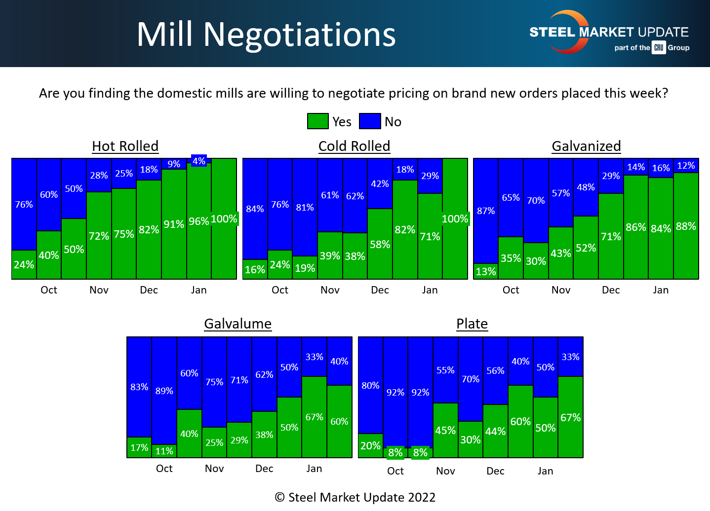 Every two weeks, Steel Market Update asks readers: Are you finding the domestic mills willing to negotiate spot pricing on new orders placed this week? Last summer, the mills were in the driver’s seat and nearly all buyers said, no, the mills were not willing to talk price. This week nearly all the buyers of hot rolled, cold rolled and galvanized steel said, yes (green bars below), the mills are now open to price negotiations to secure orders.