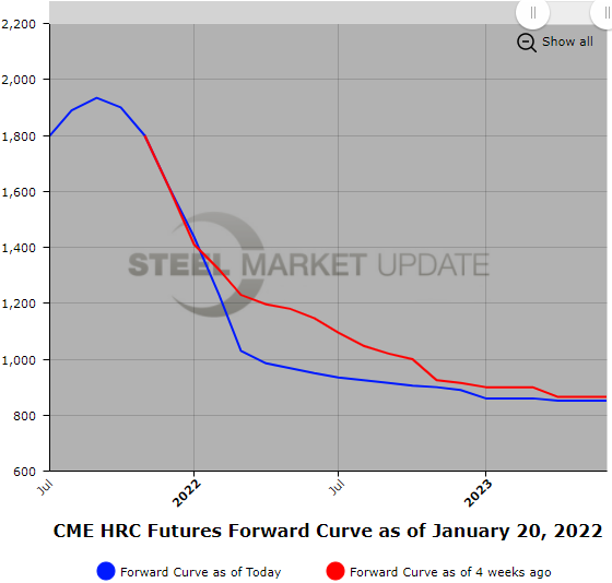 Below is a graph showing the history of the CME Group hot rolled futures forward curve. You will need to view the graph on our website to use its interactive features; you can do so by clicking here. If you need assistance with either logging in or navigating the website, please contact us at info@SteelMarketUpdate.com.