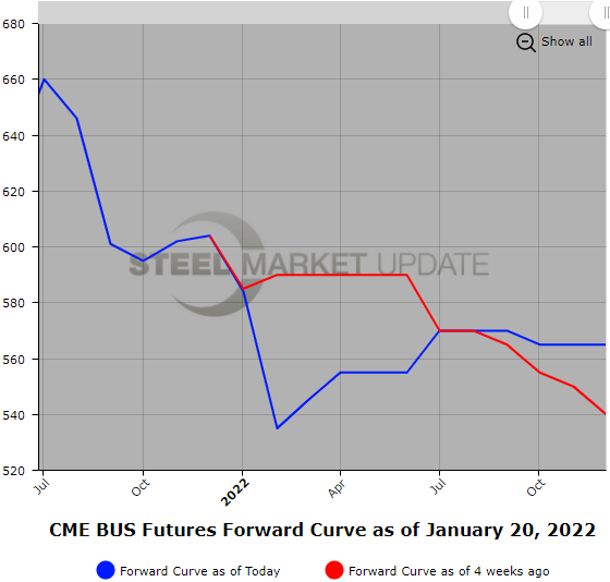 January BUS settlement just above $540/GT was a surprise development as numerous sources were anticipating only a $20/GT drop initially from the Dec’21 $604/GT level. Already over 62,000 GT of BUS futures have traded in January, a nice volume pickup from December. The BUS futures curve has declined roughly $40/GT ($582/GT to $542/GT) on an average weighted basis in the Q1’22 quarter, and $30/GT ($585/GT to $555/GT) in the Q2’22 quarter since the Dec. 31 settlement. The latter half of 2022 is flat to rising slightly. Soft to nonexistent offshore 80/20 demand has helped to keep the shred alternative supplies relatively healthy. Concern that automotive and construction sector inventories have been reported to be growing likely saw mill demand abate somewhat. COVID still seems to be gumming up some producer/manufacturing supply-demand equilibriums. Recent nearby futures activity suggests February might also be soft.
