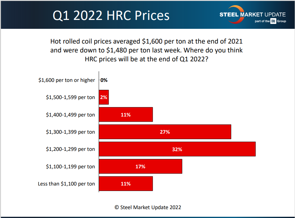 How do these buyer attitudes translate in terms of steel prices? SMU also asked: Where do you think hot rolled coil prices will be at the end of Q1 2022? A clear majority of respondents, 60%, believe the HRC price will be somewhere south of $1,300 per ton. SMU’s check of the market this week put the average price at $1,425 per ton. Calculated as a weighted average of all the responses, the prevailing prediction is for an HRC price around $1,265 per ton two months from now. That’s a total decline of another $160 per ton, or roughly $20 per ton per week. Keep in mind, though, that such a price would still be double the average HRC price of the last several years.