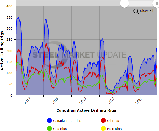 Reflecting higher energy prices, the number of active oil and gas drill rigs increased in both the U.S. and Canada this past week, according to data released Friday by oilfield services company Baker Hughes. The rig count is important to the steel industry because it is a leading indicator of oil country tubular goods (OCTG) demand.