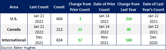 The Canadian rig count continues to recover from the late-December lull, rising 21 to 212 rigs, with oil rigs up 13, gas rigs up 8, and miscellaneous rigs unchanged. This week’s count is up 40 rigs compared to levels one year ago, with oil rigs up 38, gas rigs up 2, and miscellaneous unchanged. See the second graph below for a history of active Canadian rig counts.