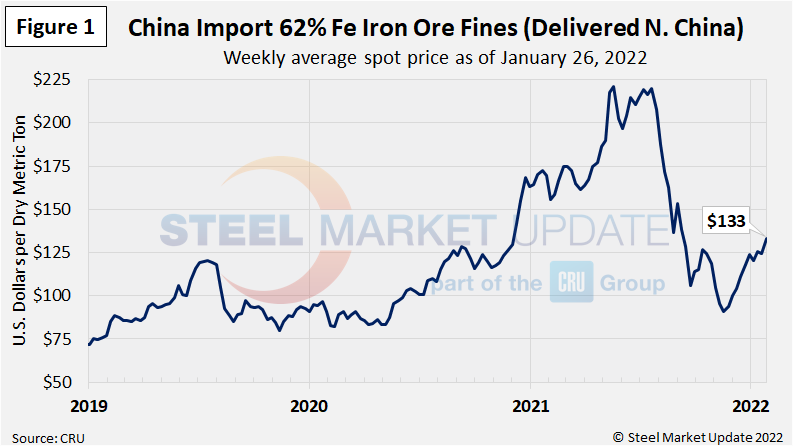 After rising to record levels last summer, the Chinese import price of 62% Fe content iron ore fines declined throughout November, reaching an 18-month low. Prices have since risen and continue to trek upward; Figure 1 shows the price of 62% Fe delivered North China at $133 per dry metric ton as of Jan. 26. Iron ore prices have increased 8% in the last 30 days, up 12% compared to three months ago, but down 21% from the price this time last year. A Jan. 25 article from CRU explains, “The iron ore price has jumped up, largely due to bullish sentiment for steel demand in China… It was also pushed up by some additional restocking in the lead up to Chinese New Year.”