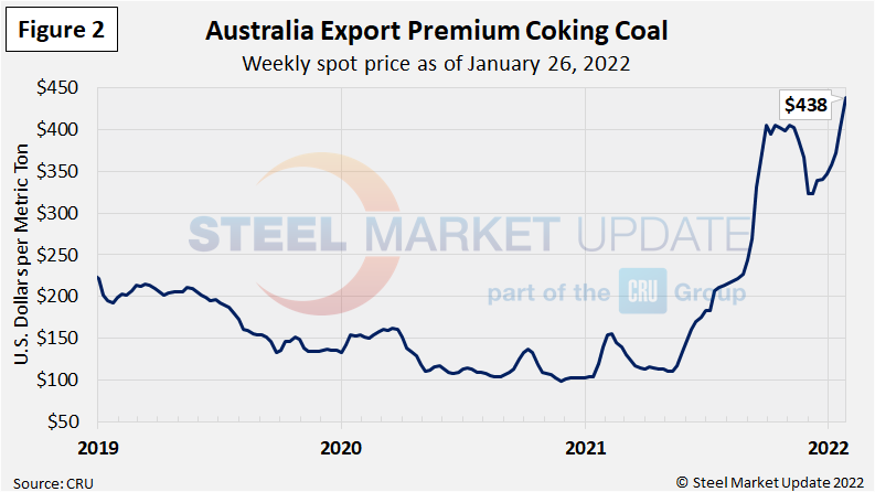 The price of premium low volatile coking coal FOB east coast of Australia was $438/dmt as of Jan. 26, surpassing the previous high of $405/dmt seen in late-September (Figure 2). A CRU report notes “offers were limited and at these high prices very few buyers were willing to transact.” Prices have increased 26% in the last 30 days, up 10% compared to three months prior, and up a whopping 214% from prices one year ago. Prior to 2021, the last time coking coal prices were this high was over 13 years ago, in July 2008.