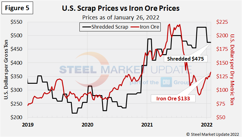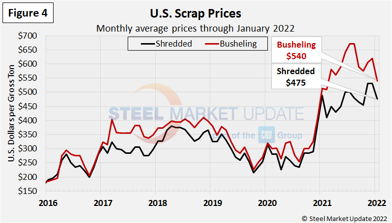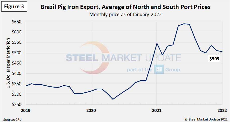 Most of the pig iron imported to the U.S. currently comes from Russia, Ukraine and Brazil. This report summarizes prices out of Brazil and averages the FOB value from the north and south ports. The latest data shows pig iron prices continue to decline from the summer peak, now averaging $505 per metric ton in January. Although down compared to recent months, pig iron prices have remained historically high for over a year. Recall that pig iron prices had reached a multi-year low of $275 per metric ton in May 2020 (Figure 3).