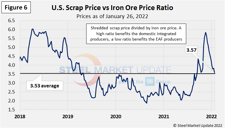 To compare the two, Steel Market Update divides the shredded scrap price by the iron ore price to calculate a ratio (Figure 6). A high ratio favors the integrated/BF producers, a lower ratio favors the minimill/EAF producers. At the current 3.57 ratio shown below, the cost advantage held by integrated producers was short-lived, having just surpassed the black four-year average ratio line in late-August 2021. Two months ago, we saw a ratio of 5.84, the highest seen since mid-2018. The scrap to iron ore ratio reached a record low of 1.86 in August 2020 (within SMU’s limited 12-year data history).