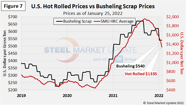 Figure 7 shows how the price of hot rolled steel generally tracks with the price of busheling scrap. Bush declined $80 per gross ton over the past month, down $130 from the July/August peak, but up $28 from one year ago. The SMU hot rolled price average declined last week for the 16th consecutive week, with the Jan. 25 average down $90 week over week to $1,335 per ton; this is down $265 from the prior month, and down $620 from the early-September peak, yet still up $195 over one year ago.