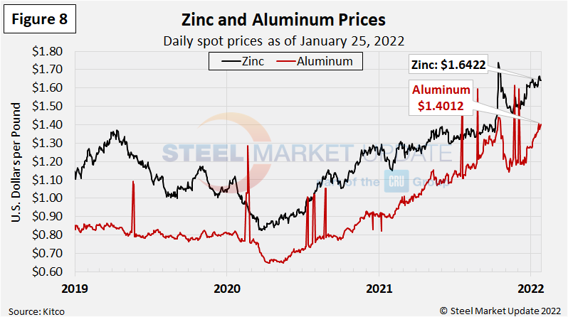 Zinc, used to make galvanized and other products, continues to rise in cost. The LME cash price was $1.64 per pound as of Jan. 25, up 5% from three months prior and up 38% from the same time last year (Figure 8). The LME cash price for zinc reached a multi-year high of $1.74 per pound in October.