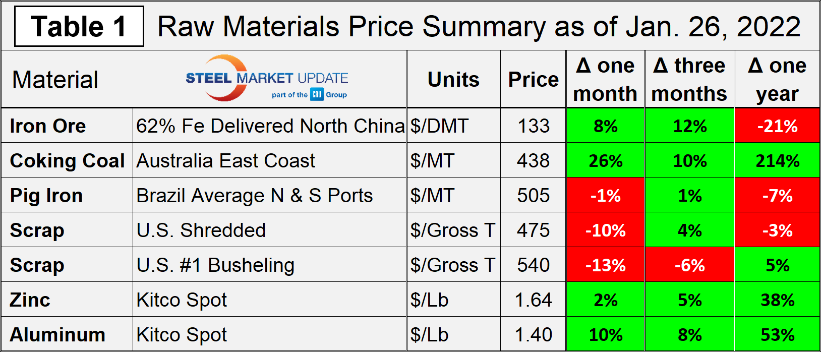 Prices for four of the seven steelmaking raw materials tracked in this SMU analysis increased over the last 30 days, while three products decreased. Through Jan. 26, coking coal prices rose 26% from one month prior, aluminum prices increased 10%, iron ore prices rose 8%, and zinc prices were up 2%. In that same time frame, scrap prices fell 10-13% and pig iron prices declined 1%.