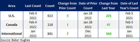 International rigs increased by 7 to 841 rigs for the month of January, an increase of 164 rigs from the same month one year ago. For a history of both the U.S. and Canadian rig count, visit the Rig Count page on the Steel Market Update website here.