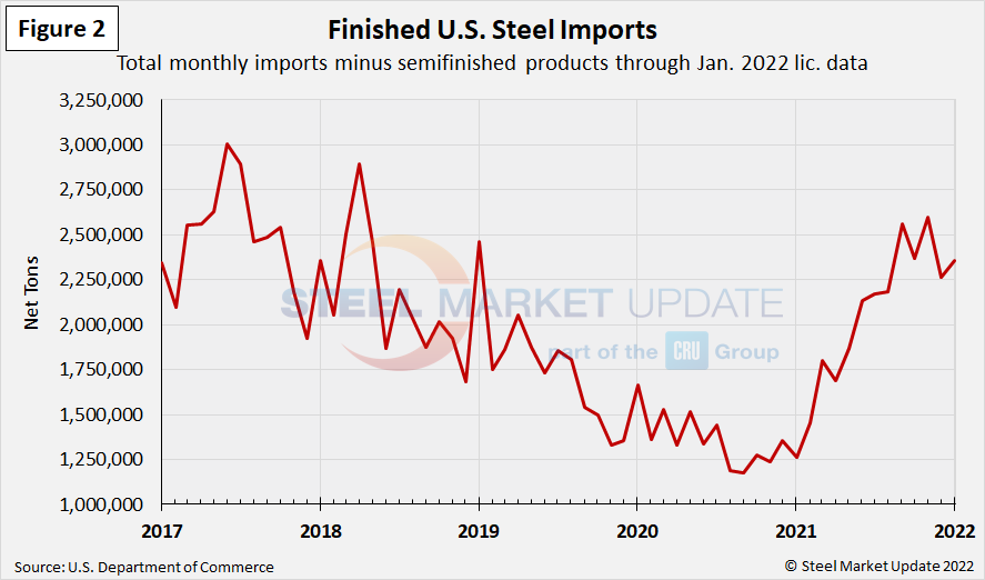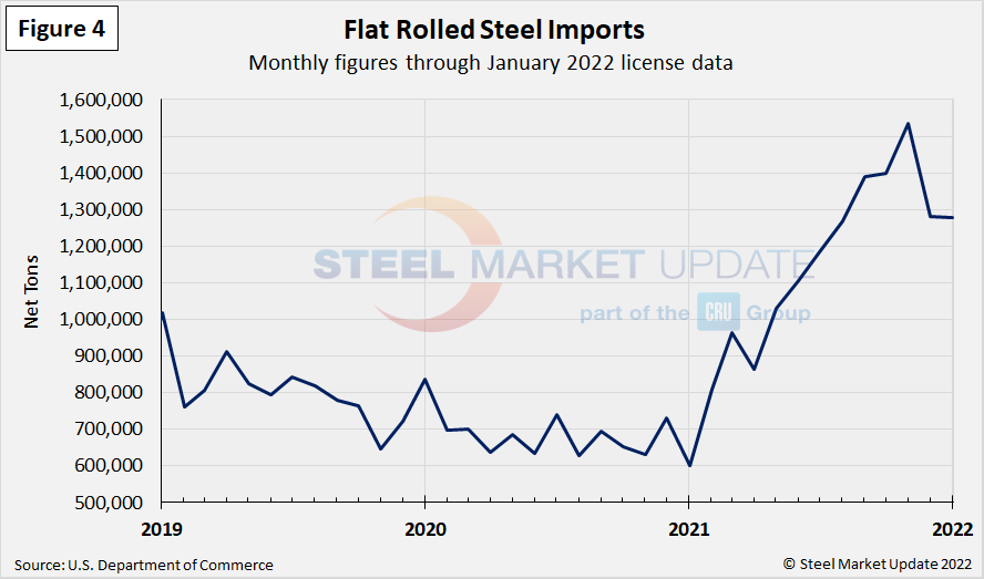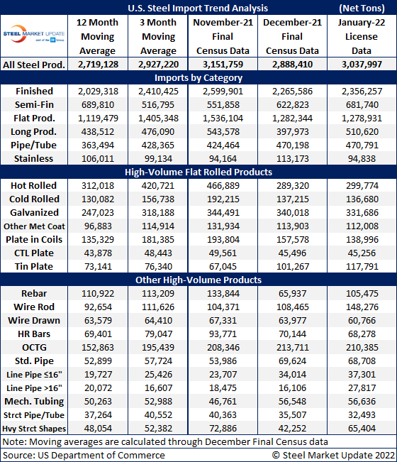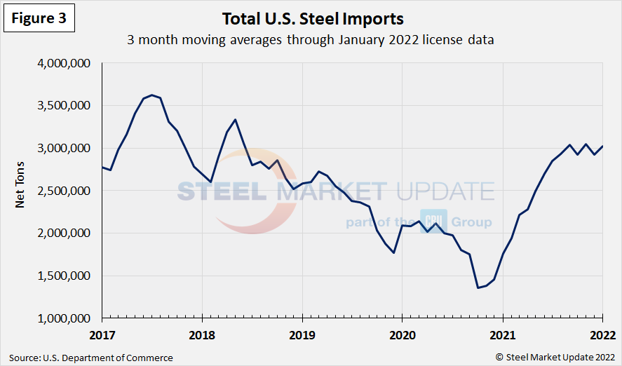 Due to large month-to-month swings in semifinished imports, the chart below shows total monthly imports on a three-month moving average (3MMA) basis in an attempt to more accurately display U.S. steel import trends. The 3MMA through final December data was 2.93 million tons, down from November’s 3+ year high of 3.05 million tons. Recall that the lowest 3MMA level in SMU’s recent history was November 2020 at 1.36 million tons. Looking through the latest January license data, that 3MMA is currently at 3.03 million tons.