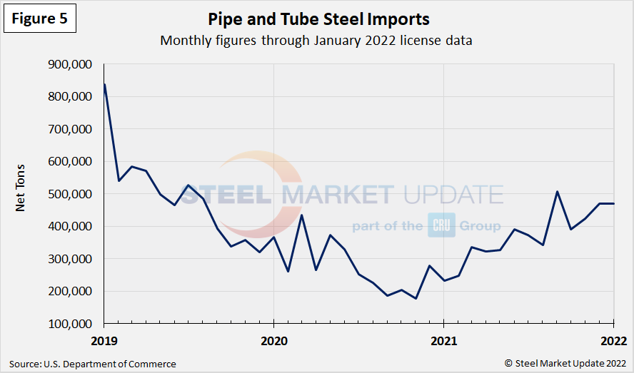 The two charts below show monthly imports grouped by product category: flat rolled imports and pipe and tube imports. As reported in the preliminary data, flat rolled imports slipped in December to 1.28 million tons, down 17% from November’s multi-year high of 1.54 million tons. January license data currently shows 1.28 million tons of flat rolled imports coming into the country, while February licenses are at 198,000 tons through the seventh day of the month. Pipe and tube imports rose 11% to 470,000 tons in December, the second highest level in 2+ years. January pipe and tube import licenses are currently at 471,000 tons, while February licenses are at 104,000 tons.