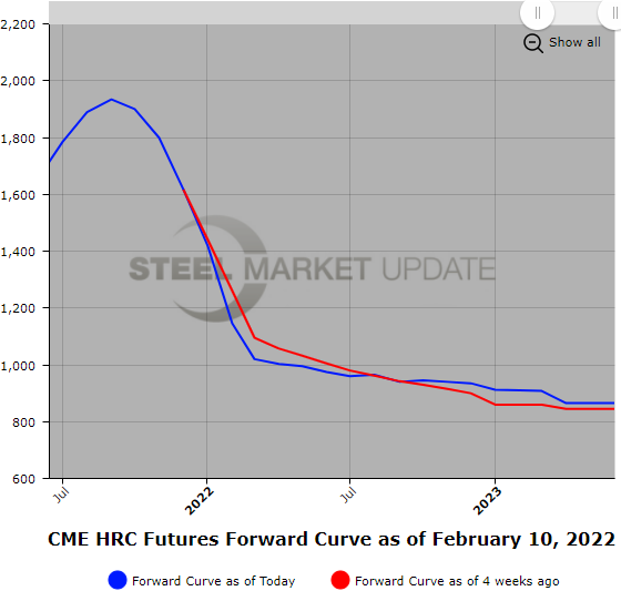 HR spot price declines picked up steam this week as all the HR indexes were down significantly. The front month CME HR contract has settled below $1,150/ST today and is over $100/ST lower than a month ago. However, a look further out the forward curve paints a different picture. The latter half average price of Calendar 2022 has HR futures $10/ST higher than a month ago ($938/ST) and the Q1’23 quarter average price will settle up $50/ST ($910/ST). Latest price moves suggest market participants are focusing on the narrowing of the U.S. price versus global HR prices as witnessed by some profit-taking in this price range, which coincides with an earlier price peak. The Q2’22 HR average price today rose $45/ST just since yesterday following the large spot decline. Despite the price movement, the curve remains pretty flat as reflected by the small discount between Mar’22 HR and Mar’23 HR ($1,020/ST settle versus $908/ST settle), which is just $112/ST over 13 months forward.