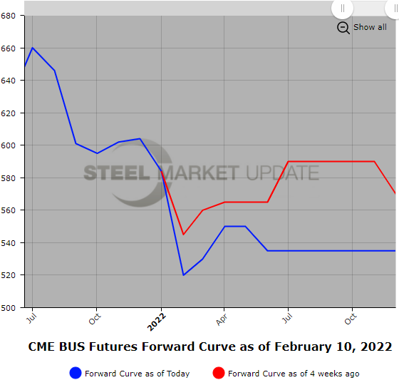 Below is another graph showing the history of the CME Group busheling scrap futures forward curve. You will need to view the graph on our website to use its interactive features; you can do so by clicking here.