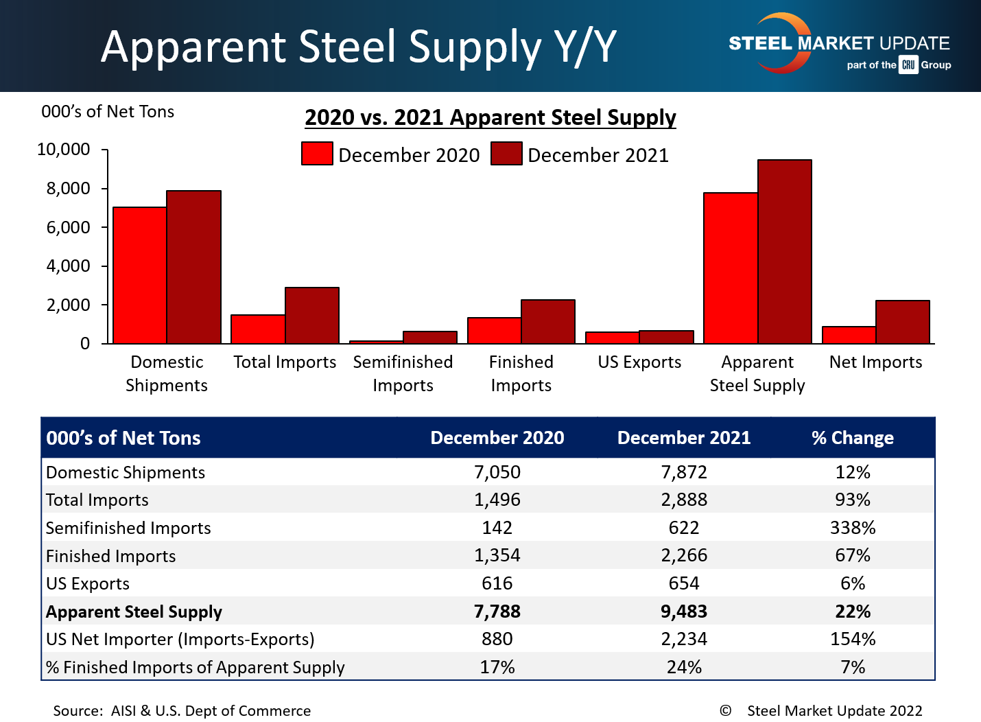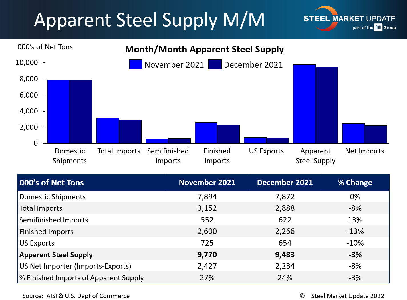 U.S. apparent steel supply levels slipped 3% from November to December, down 286,000 net tons to 9.48 million net tons, according to the latest U.S. Department of Commerce and American Iron and Steel Institute data. Recall that September 2021 saw the highest monthly supply level in over six years, going back to January 2015 when supply surpassed 10 million tons.