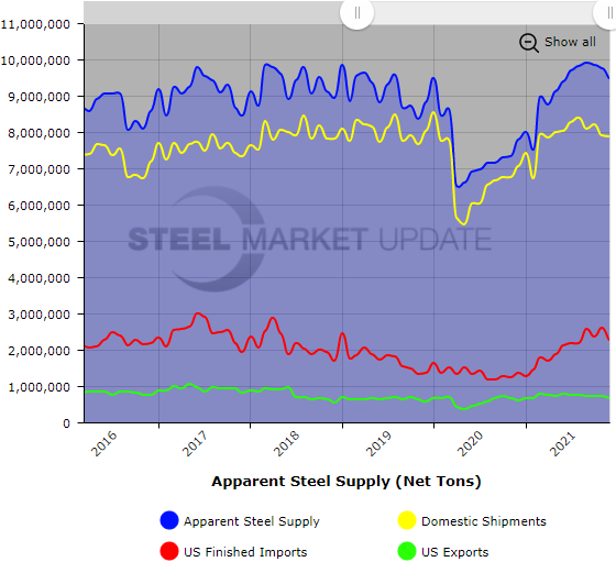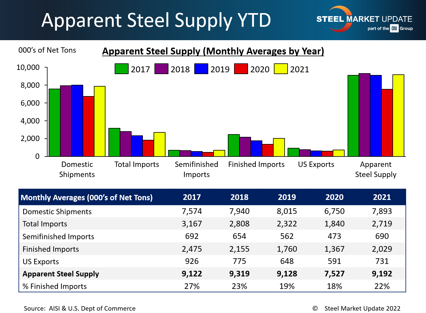 Apparent steel supply, a proxy for demand, is determined by combining domestic steel mill shipments and finished U.S. steel imports, then deducting total U.S. steel exports.