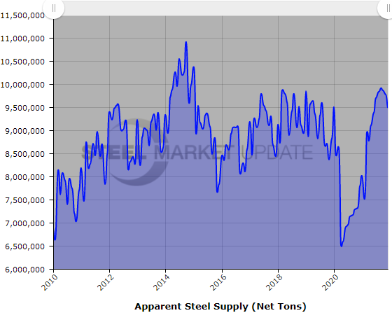 To see an interactive graphic of our Apparent Steel Supply history (example shown below), visit the Apparent Steel Supply page in the Analysis section of the SMU website. If you need any assistance logging into or navigating the website, contact us at info@SteelMarketUpdate.com.
