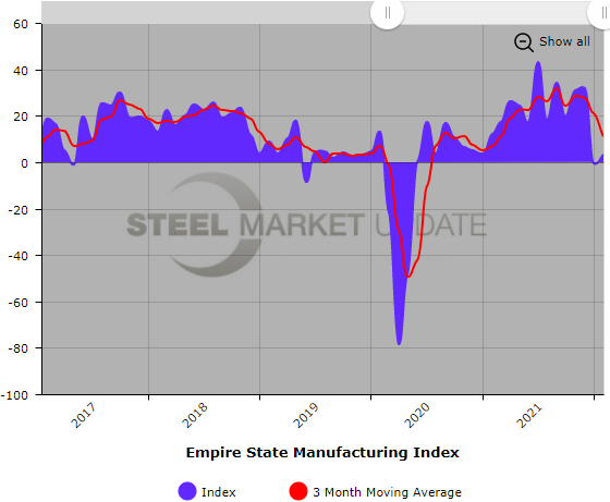Below is a graph showing the history of the Empire State Manufacturing Index. You will need to view the graph on our website to use its interactive features. You can do so by clicking here. If you need assistance logging into or navigating the website, please contact us at info@SteelMarketUpdate.com.
