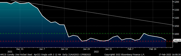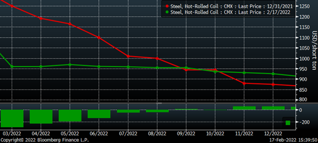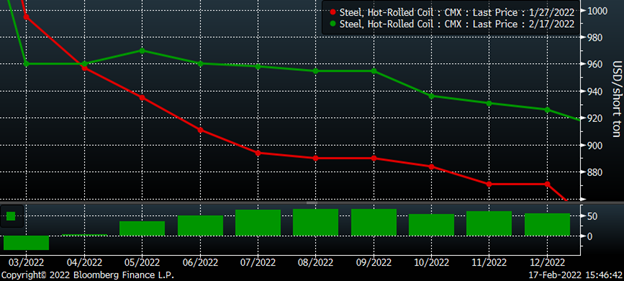 The front of the HRC futures curve has fallen dramatically so far this year. The March future has declined by $290, April $230, May $195 and June $140 as of this afternoon’s settlement. The curve has moved out of its steep downward sloping backwardation into an almost flat curve, confirming the supply shortage has passed.