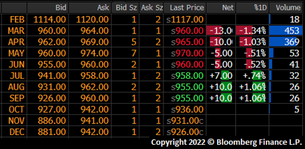 The breakneck volatility seen at the start of the year has rapidly dissipated. During the first three weeks of ’22, the April future fell $136 from $1,190 to $954. Since Jan. 15, the April future has been stuck in a range between $960 and $1,000.