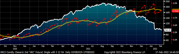 The spread between the rolling second month HR future and the spot/index price has narrowed dramatically in recent weeks and the two could be at parity in the next few weeks. Both the futures market and a good number on the physical side appear to believe there will be a floor in this $950 area. Hard to say as the future is always changing, but I do wonder what happens if the price of HR falls below this $950-ish perceived floor and area of congestion in the futures market. If the majority of market participants believe that there is support of a floor at $950 and then the floor doesn’t hold, it should create a reaction with a lot of energy behind it. In other words, if the market doesn’t hold the $950 level, look out below.