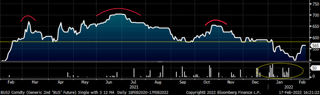 Since the end of January, the CME busheling futures curve has rebounded nicely with April and May gaining $50 and $45, respectively, most of which followed February’s settlement.