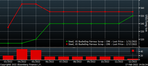 Open interest in busheling has exploded in 2022, setting a new all-time record high at 133,440 tons as of the expiration of February’s contract (2/10).